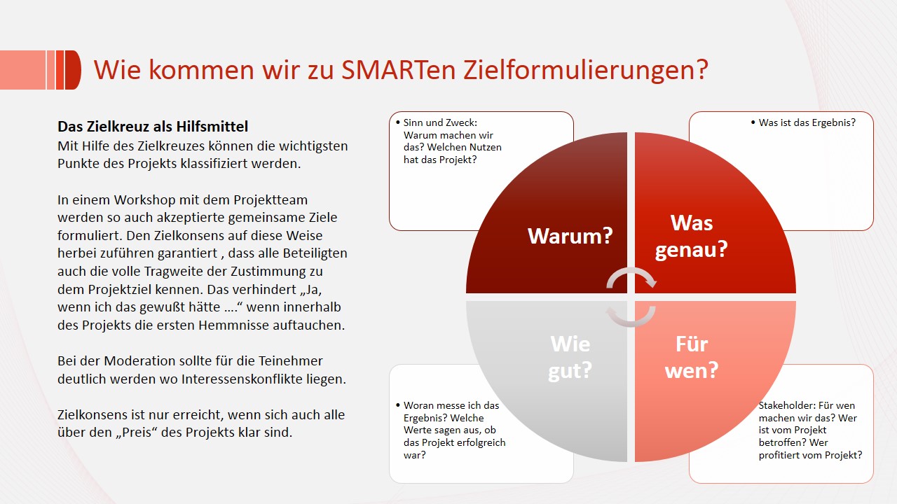 Wie kann der Projektleiter aus Absichtserklärungen und schwammigen Vorgaben nun akzeptierte Ziele? Am besten in dem die betroffenen Mitarbeiter in die Zielformulierung eingebunden werden.
